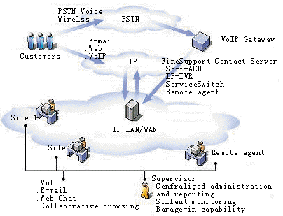 FineSupport發(fā)揮了軟交換和VoIP技術(shù)的優(yōu)勢(shì),并融合了Internet的特性,使顧客與呼叫中心之間不僅可以通過語音進(jìn)行通信,還可以通過電子郵件、傳真、文字交談進(jìn)行通信,甚至可以實(shí)現(xiàn)在線推送網(wǎng)頁、在線網(wǎng)頁導(dǎo)航等業(yè)務(wù)。呼叫中心的客服人員只需具備一臺(tái)多媒體電腦和一副耳麥,即可向顧客提供完備的服務(wù)。
