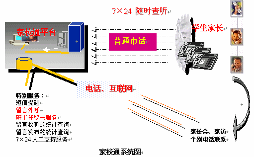 捷通華聲從關(guān)愛青少年成長出發(fā),提出了應(yīng)用于教育領(lǐng)域溝通平臺"家校通"系統(tǒng)的語音服務(wù)解決方案。家校通系統(tǒng)是一個融合了語音合成、計算機網(wǎng)絡(luò)集成綜合服務(wù)、互聯(lián)網(wǎng)、數(shù)據(jù)庫等多種先進(jìn)IT技術(shù)為一體的新一代家校聯(lián)系工具。它充分利用互聯(lián)網(wǎng)與目前最為普及的公眾電話等資源,為學(xué)校提供多樣化的信息發(fā)布渠道,同時強大的7×24小時的留言發(fā)布和查聽服務(wù)功能,為老師和家長提供一種全新、高效、便捷的交流方式,大大提高了家長的滿意度,提升了學(xué)校的管理實力。
