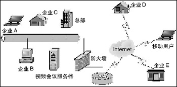 ● Conference可以滿足企業(yè)用戶桌面和會(huì)議室級(jí)別會(huì)議的需求,并且在一個(gè)系統(tǒng)中,可以同時(shí)進(jìn)行多個(gè)會(huì)議而互不干擾,使應(yīng)用更加方便,典型的應(yīng)用示意圖如下所示: