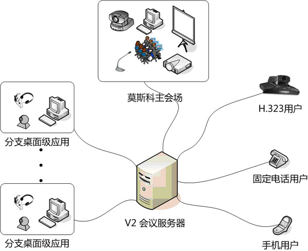 俄羅斯百事可樂公司莫斯科總部和俄羅斯其它各地分支機(jī)構(gòu)通過公眾互聯(lián)網(wǎng)連接,以V2視頻會(huì)議系統(tǒng)為紐帶,將不同的參會(huì)用戶連接在一起,實(shí)現(xiàn)即時(shí)的音視頻溝通及數(shù)據(jù)協(xié)作。不僅是普通的PC機(jī)用戶,包括傳統(tǒng)H.323用戶,手機(jī)和固定電話用戶等都可以加入V2視頻會(huì)議。