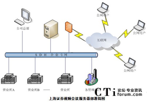 上海證券一直以來都重視IT在企業(yè)發(fā)展中的重要作用,公司成立了信息技術總部專門負責公司信息化平臺的建設與維護。2009年4月上海證券視頻會議項目進入最終選型階段,經(jīng)過多次測試和評比,最終選用音視頻效果好,運行穩(wěn)定,成熟度高的北京威速科技有限公司視頻會議產(chǎn)品V2 Conference視頻會議系統(tǒng)。2009年6月完成了項目實施部署。