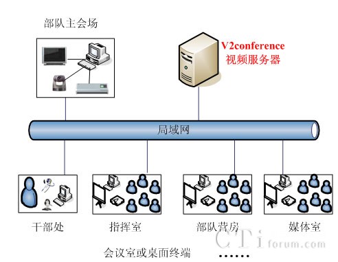 V2視頻會(huì)議系統(tǒng)建立在森警部隊(duì)專網(wǎng)的基礎(chǔ)上,各區(qū)作戰(zhàn)部隊(duì)會(huì)議室、指揮室和部隊(duì)營(yíng)房會(huì)議均為光纖100M接入,每個(gè)中隊(duì)官兵營(yíng)房都集中建立了培訓(xùn)會(huì)議室,負(fù)責(zé)日常新兵的培訓(xùn)教育。在現(xiàn)有的網(wǎng)絡(luò)基礎(chǔ)上構(gòu)建了V2視頻會(huì)議系統(tǒng),來滿足各個(gè)中隊(duì)和教導(dǎo)大隊(duì)的網(wǎng)絡(luò)會(huì)議和培訓(xùn)需求。在每個(gè)節(jié)點(diǎn)會(huì)議室部署了電視、攝像頭和相關(guān)音響設(shè)備,目前已經(jīng)建成10多個(gè)網(wǎng)絡(luò)會(huì)議節(jié)點(diǎn)的遠(yuǎn)程視頻培訓(xùn)系統(tǒng)。