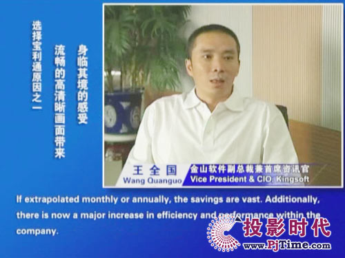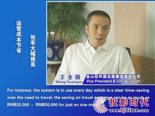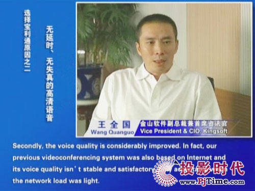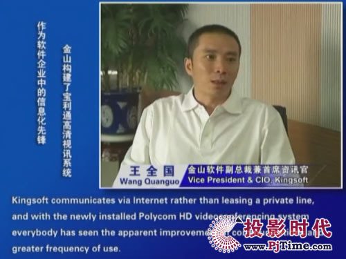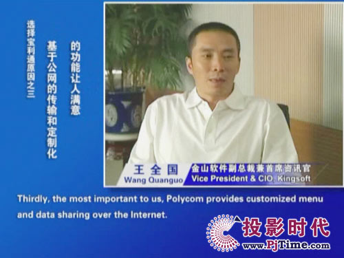 金山軟件副總裁兼首席資訊官王全國先生說道:“對于軟件行業(yè)來說,及時(shí)、高效的溝通是保持競爭優(yōu)勢的重要前提。相比之前使用的標(biāo)清產(chǎn)品,寶利通高清視頻會議系統(tǒng),提供了完全不同的體驗(yàn),流暢的高清晰畫面猶如真實(shí)的面對面溝通。而且我們公司并沒有申請專線,所有的應(yīng)用都是基于公網(wǎng)實(shí)現(xiàn)的。另一方面,新型全中文定制菜單的運(yùn)用,令我們使用起來非常方便,這更提高了我們使用視頻通信手段實(shí)現(xiàn)異地溝通的熱情!