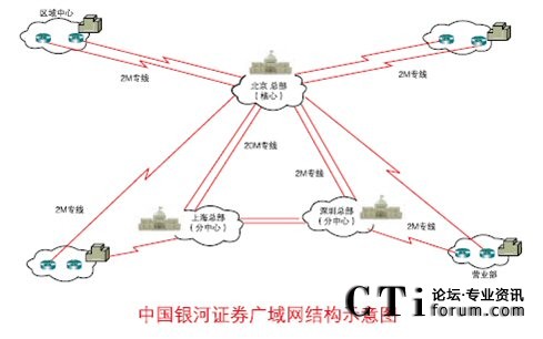 銀河證券采用二級網(wǎng)絡結構,其中一級采用三中心的冗余結構;二級為各營業(yè)部。營業(yè)部線路上采用雙專線的冗余線路方式,其中兩條線路分別屬于兩家不同的電信運營商。營業(yè)設備上采用雙設備,保證了營業(yè)部在設備上的冗余,避免硬件設備單點故障,同時實現(xiàn)了業(yè)務網(wǎng)與辦公網(wǎng)的物理分離。