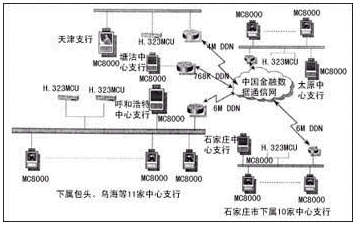 為推進(jìn)金融行業(yè)的金融電子化進(jìn)程,并充分利用中國國家金融數(shù)據(jù)通信網(wǎng)(CNFN)的資源,中國人民銀行天津大區(qū)行于1999年建立了首個(gè)運(yùn)行在CNFN上的基于IP的H.323電視會(huì)議網(wǎng),實(shí)現(xiàn)了華北范圍內(nèi)天津、內(nèi)蒙古、河北、山西兩省一區(qū)一市的36家人民銀行機(jī)構(gòu)的會(huì)議電視聯(lián)網(wǎng)。VCON公司提供的基于IP的H.323視頻會(huì)議第四代解決方案在該系統(tǒng)中發(fā)揮了重要作用。