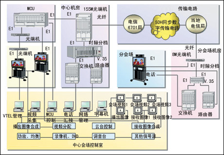 人民法院對審判信息保密性具有嚴格要求。為保證電視會議系統(tǒng)穩(wěn)定安全運行,電路接口全部選用了性能優(yōu)良但價格較高的E1方式,由主會場-MCU-光端機-光調(diào)制解調(diào)器-分會場設備之間電路非常簡捷。由于網(wǎng)絡設備均選用E1接口,節(jié)省了G.703-V.35轉(zhuǎn)換設備,沒有因轉(zhuǎn)換設備產(chǎn)生的信號損耗或故障隱患。