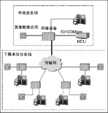 各節(jié)點(diǎn)的接入采用一條512Kbps帶寬的DDN/E1線路接入本地電信公司;在總部采用集中式接入中央電信公司,接入中心的電路帶寬應(yīng)該是多條信道捆綁的帶寬,中心節(jié)點(diǎn)交換機(jī)采用10/100Mbps與MCU相連,總部主會(huì)場(chǎng)的視頻終端通過接入交換機(jī)與MCU進(jìn)行通信。