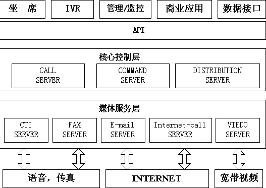 系統(tǒng)核心控制層由Call Server (呼叫控制)、Command Server(命令服務)、Distribution Server(路由服務) 等功能模塊組成,分別用于呼叫信息的統(tǒng)一管理、命令的接收、命令格式轉換和轉發(fā)以及呼叫的分配和智能路由等。