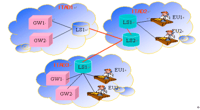 圖中的紅線是TRIP協(xié)議控制下的各個域中網(wǎng)關(guān)路由信息在LS之間被聚合、被交換、被廣播、被同步的路徑。各個ITAD管理者首先簽訂適用于交互網(wǎng)關(guān)信息的TRIP協(xié)議,然后通過管理手段建立起這些信息共享的聯(lián)合體,一個域中的LS同其它域中的LS都成為聯(lián)合體的一員,于是這些LS通過這種方式就可以交換網(wǎng)關(guān)信息了。在圖中,ITAD1的LS1與ITAD2的LS1相連,ITAD2的LS2又依次與ITAD3的LS1相連通,通過TRIP協(xié)議,ITAD2的LS2就可以了解ITAD1上的兩個網(wǎng)關(guān),這兩個網(wǎng)關(guān)的網(wǎng)關(guān)路由信息就可以由ITAD2的終端用戶通過其前端(front-end)進行訪問。在ITAD3中,既有終端用戶,又有網(wǎng)關(guān),ITAD3的LS1通過ITAD2上LS2已經(jīng)聚合后的廣播消息來了解ITAD1上的網(wǎng)關(guān)。