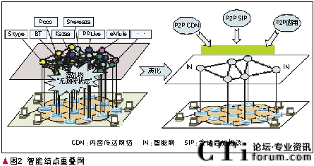 智能節(jié)點重疊網是覆蓋在IP核心網上的傳統(tǒng)的彈性重疊網(RON)技術與分布式哈希表(DHT)技術相結合的新型重疊網技術,包括自動組網、網絡資源管理、路由優(yōu)化等關鍵技術。其基本結構是保持TCP/IP協(xié)議不變,原來的3層變成3-層,在其上建立一個智能結點重疊網做為3+層,在此分布式管理平臺上提供流量監(jiān)控、流量控制、QoS、病毒防止和安全性等服務。智能結點重疊網的另外一個任務是為各種P2P應用提供支撐環(huán)境。它可以為在互聯(lián)網上采用不同協(xié)議和軟件的各種P2P業(yè)務,提供統(tǒng)一的支撐環(huán)境。主要是提供P2P CDN和P2P SIP。智能結點重疊網如圖2所示。