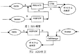 A2D法(Analog to Data) A2D法即事先將呼入呼叫中心的DTMF電話通過VoIP網(wǎng)關(guān)轉(zhuǎn)化為IP電話,再和來自Internet的IP電話一同接入座席代表。A2D法實現(xiàn)相對比較麻煩,但其將絕大部分工作放到計算機網(wǎng)絡(luò)這個開放的軟件平臺來做,除了有利于更新和開發(fā)外,還能降低成本。同時,這種結(jié)構(gòu)能在地理上和物理上伸縮自如,不僅便于高度集成,而且便于跨地區(qū)構(gòu)建。