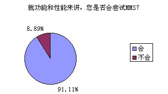 題8的調查結果對于中國移動來講絕對是充滿誘惑的,高達91.11%的被訪者表示他們非常愿意嘗試MMS的功能和服務,無疑這對ICP們(MMS服務的重要載體)也是一針強心劑啊!