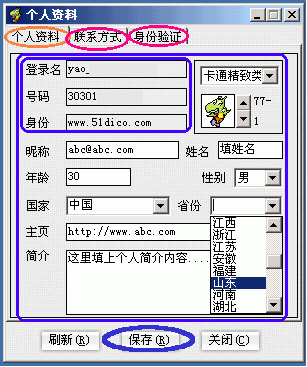 、冱c(diǎn)按"個人資料"命令(圖3的B1處),彈出"個人資料"修改窗口,包括"個人資料/聯(lián)系方式/身份驗(yàn)證"這三大類選項(xiàng)卡。其中:"個人資料"選項(xiàng)卡下,除登錄名、號碼和身份這三項(xiàng)不可更改外,其余各項(xiàng)都是可填或可選項(xiàng),據(jù)你所需進(jìn)行修改就是了(下圖4)。另外,還有"聯(lián)系方式"和"身份驗(yàn)證"兩大選項(xiàng),怎么個用法自己點(diǎn)開一看就明白了你!