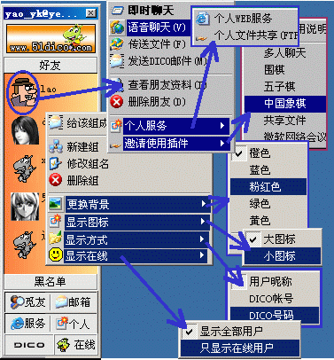 2、在其中某好友頭像上左鍵單擊,在彈出快捷功能菜單中,可隨時:查看好友相關(guān)資料的更改、刪除某人;即時/語音聊天、傳送文件、發(fā)送DICO郵件;個人服務(wù)(WEB/ETP)及使用共享插件等。