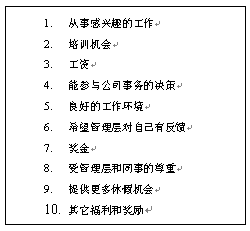 10. 來自公司高層的認(rèn)可。這是一個非常有效的作法,能得到公司高層的認(rèn)可對很多人來說,是一生都可以值得回憶的事情。如果在一家全球的大公司,和公司CEO共同進(jìn)餐,得到公司CEO的親筆信,和CEO合影等都是非常高的榮譽(yù)。當(dāng)然,這個作法不是可以經(jīng)常用的。因?yàn),如果用得太?jīng)常了,就可以失去了一種"神秘感"或"來之不易"的感覺。