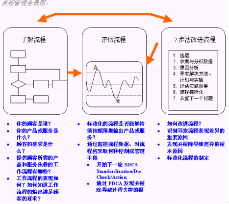 "TQM"核心思想究竟是什么呢?簡言之,"TQM"分為三步:了解流程,檢討流程,改進流程。下圖可以很好說明這種思想: