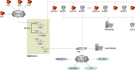 系統(tǒng)的核心是話路語音中心,主要實(shí)現(xiàn)兩大功能: 一是實(shí)現(xiàn)180系統(tǒng)的話路語音平臺; 二是實(shí)現(xiàn)與電話網(wǎng)絡(luò)的接口。以1臺Pentium級工控機(jī)作為處理平臺,2塊30線數(shù)字中繼語音處理卡,1塊帶振鈴器的24線模擬座席電話轉(zhuǎn)接卡,1塊4路傳真卡,卡間以語音處理行業(yè)的標(biāo)準(zhǔn)總線SC總線相連。系統(tǒng)與電信網(wǎng)絡(luò)的接口采用E1數(shù)字中繼線,信令方式采用中國一號信令為隨路信令,工控機(jī)用TCP/IP協(xié)議與局域網(wǎng)相連。
