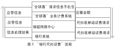“銀行代扣話費”方式 對于“由非銀行端發(fā)起,但需銀行代扣收的交易”,其執(zhí)行通過多種接入方式(如手機短消息、GPRS、客戶服務中心、自助終端、因特網(wǎng)等)提交信息,內(nèi)容包括“全球通”手機號、“神州行”手機號、IP電話卡號、付費金額、銀行賬戶、密碼、交易類型等。