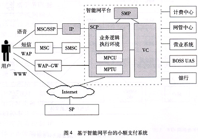 鑒于以上原因,目前中國移動(dòng)正在建設(shè)的全國范圍的小額支付系統(tǒng)已確定采用基于智能網(wǎng)平臺(tái)的建設(shè)方式;谥悄芫W(wǎng)平臺(tái)的小額支付系統(tǒng)如圖4所示。