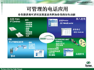 針對IP CENTREX應(yīng)用,Sonus公司可提供名為Sonus SMARRT Hosted PBX的解決方案。該方案可支持現(xiàn)有的電話基本業(yè)務(wù)和補(bǔ)充業(yè)務(wù),為終端用戶和管理者提供基于Web的服務(wù)及與Outlook集成的客戶端系統(tǒng);跇(biāo)準(zhǔn)的接口,該方案還集成了支持運(yùn)營商OSS系統(tǒng)的工具。