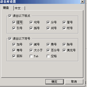 如果需要進一步的調整,可以選擇菜單里的“設置……”。打開設置窗口(如圖3)。窗口共分四個選項,每個選項里除了剛介紹的幾種常用功能調整外,還可以控制歡迎畫面、開始畫面、設定存儲等功能,規(guī)定提示速度、朗讀速度的快慢,選擇提示方式,設定提示報警條件。在“語音庫”選項中還可以選擇朗讀為男聲還是女聲。單擊“設置”按鈕,可以根據具體需要選擇“鍵盤”或“中文”里被朗讀標點符號的種類(如圖4)。