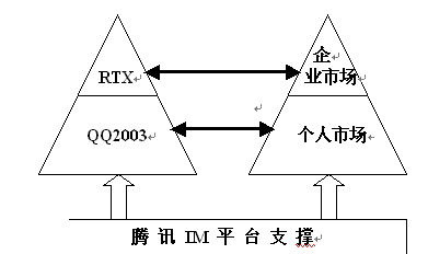 1、從QQ2003到RTX是對IM市場的全方位介入。騰訊推出革命性的QQ2003,緊接著又啟動(dòng)RTX新品牌進(jìn)軍企業(yè)市場,標(biāo)志著其不滿足于將自身定位為娛樂及時(shí)信息平臺和服務(wù)提供商,而是對商務(wù)市場和個(gè)人市場進(jìn)行理性細(xì)分后的一種戰(zhàn)略決策,向兩類不同的用戶推出不同的品牌,提供不同的服務(wù)(如下圖),既保證了不同用戶的需求特質(zhì),又有效避免了品牌混亂。
