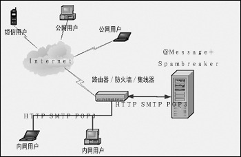3Rsoft公司W(wǎng)eb郵件系統(tǒng)和Spambreaker裝在同一臺服務(wù)器上,相當(dāng)于一臺硬件服務(wù)器上的兩個(gè)Server進(jìn)程。外部郵件的接收和內(nèi)部郵件的發(fā)送(包括外發(fā)和本服務(wù)器內(nèi)部發(fā)送)都經(jīng)過Spambreaker,所有被投遞郵件都得到過濾和病毒查殺,構(gòu)成安全的郵件防護(hù)系統(tǒng)。