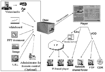 在對市場上現(xiàn)有產(chǎn)品進行了綜合比較后,上海市稅務(wù)局決定使用美國Winnov公司的Cbox系統(tǒng)。Cbox是一種視頻采集和控制系統(tǒng),可以支持多種格式文檔,通過URL方式可以提供對未來文檔格式的支持,在操作時只需將文檔提供給Cbox,其余工作由Cbox自動完成; 自動攝像頭控制可預設(shè)三個位置,Cbox自動感應(yīng),并支持助教、直播、點播等模式,同時具有多種分發(fā)方式,可以存在局域網(wǎng)共享目錄、自動上傳至FTP和刻錄光盤。