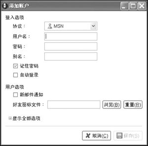選擇協(xié)議:在“協(xié)議”下拉列表框中選擇你要使用的即時通訊工具名稱,例如這里我們準(zhǔn)備添加一個MSN賬號,那么就選擇“MSN”協(xié)議;如果是添加ICQ賬號,那么應(yīng)該選擇“AIM/ICQ”協(xié)議。