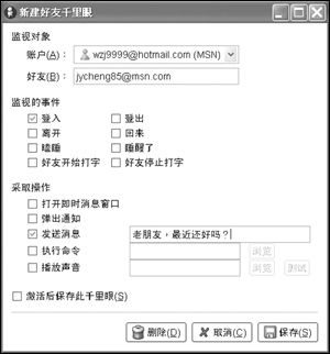 MSN可以在好友登錄時設(shè)置提示,但卻無法像QQ一樣自動發(fā)出特定問候,這未免有些遺憾。在Gaim中,我們可以為那些暫時不在線的好友添加千里眼監(jiān)視功能(如圖3),這里可以監(jiān)視的事件包括登入、登出、離開、回來、瞌睡、睡醒了、好友開始打字、好友停止打字等等,而可以設(shè)置的提示方式是打開即時消息窗口、彈出通知、發(fā)送消息、執(zhí)行命令、播放聲音等等,非常豐富!