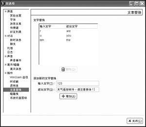 文本替換:根據(jù)用戶自定義的規(guī)則替換發(fā)出的消息,其實差不多類似于縮寫功能,你可以把一段話定義成一個字母,以后只要輸入這個字母,就會直接顯示這段話了。比如在缺省設(shè)置下,輸入“r”即可送出“are”,輸入“u”即可送出“you”(如圖7)。