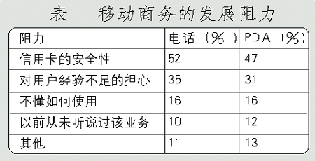 手機(jī)支付業(yè)務(wù)的進(jìn)一步發(fā)展主要受制于用戶對(duì)該項(xiàng)業(yè)務(wù)的接受程度。Forrester研究公司的研究表明,超過(guò)一半的被訪者認(rèn)為信用卡的安全性是移動(dòng)商務(wù)發(fā)展的主要阻力。(調(diào)查結(jié)果見(jiàn)下表)