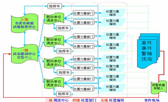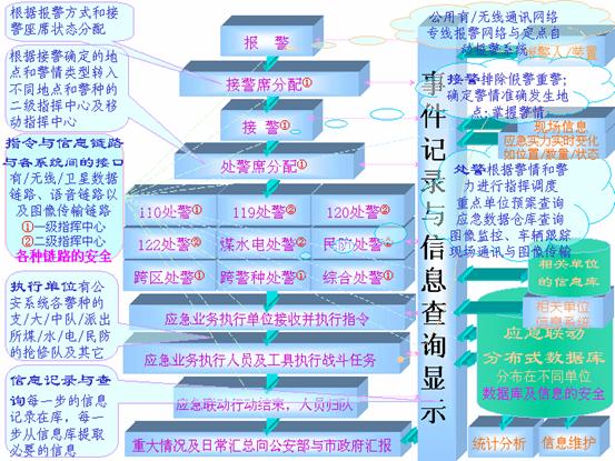 根據(jù)接過來的警情,應(yīng)急聯(lián)動系統(tǒng)向處置力量部門發(fā)出指令派出處置力量編組到現(xiàn)場,并根據(jù)現(xiàn)場反饋回來的信息,決定是否增援或歸隊。事件記錄通過局域網(wǎng)被送到相應(yīng)的處警員終端,處警員通過計算機(jī)輔助調(diào)度系統(tǒng)查詢相關(guān)資料,制定反應(yīng)措施,并向相關(guān)聯(lián)動單位發(fā)出具體調(diào)度指令。在緊急事件發(fā)生時,相應(yīng)的電子預(yù)案會被觸發(fā)啟動。如果發(fā)生了重大災(zāi)難,險情或特殊的事件,則可以啟用城市緊急狀態(tài)指揮室,由首長進(jìn)行統(tǒng)一指揮。