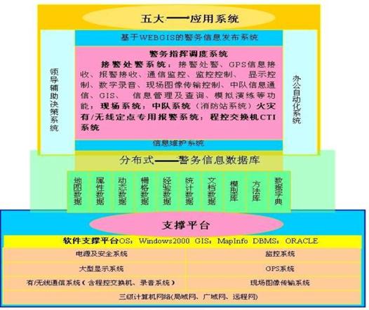 支撐平臺有計算機(jī)網(wǎng)絡(luò)系統(tǒng)、監(jiān)控系統(tǒng)、顯示系統(tǒng)、GPS系統(tǒng)、有/無線通信系統(tǒng)、圖像傳輸系統(tǒng)、電源及機(jī)房、軟件支撐平臺等。其中,計算機(jī)網(wǎng)絡(luò)系統(tǒng)包括指揮中心、二級指揮中心與移動指揮中心、業(yè)務(wù)執(zhí)行機(jī)構(gòu)(如:應(yīng)急中隊、派出所等)之間的三級計算機(jī)網(wǎng)絡(luò),即指揮中心局域網(wǎng)絡(luò)、業(yè)務(wù)機(jī)關(guān)網(wǎng)絡(luò)、與分支機(jī)關(guān)的廣域網(wǎng)絡(luò)、與移動指揮中心的遠(yuǎn)程訪問網(wǎng)絡(luò)。指揮中心與二級指揮中心、分支機(jī)構(gòu)、移動中心之間有語音通信、數(shù)據(jù)通信,指揮中心與移動中心有語音通信、數(shù)據(jù)通信(無線)、現(xiàn)場圖像傳輸;指揮中心與公安其它機(jī)構(gòu)通過撥號網(wǎng)絡(luò)訪問(內(nèi)網(wǎng)),指揮中心與普通老百姓通過撥號網(wǎng)絡(luò)訪問(外網(wǎng))。