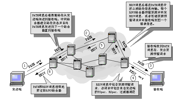 綜合服務(wù)和資源預(yù)留協(xié)議IntServ/RSVP:以RSVP信令向網(wǎng)絡(luò)提出業(yè)務(wù)流傳輸規(guī)格(Flowspec),并建立和拆除傳輸路徑上的業(yè)務(wù)流狀態(tài)。主機(jī)和路由器節(jié)點(diǎn)建立和保持業(yè)務(wù)流狀態(tài)信息。盡管RSVP經(jīng)常用于單個(gè)流,但也用于聚流的資源預(yù)留。