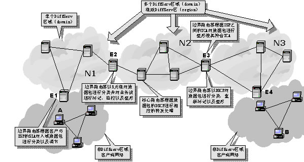 DiffServ區(qū)(region)則是由連續(xù)的DS區(qū)域構(gòu)成。一個(gè)DS區(qū)內(nèi)的DS區(qū)域可以支持不同的PHB組,并且各自區(qū)域的DSCP到PHB的映射函數(shù)也可能不相同。在不同的DS區(qū)域之間,必須對SLA和TCA進(jìn)行調(diào)節(jié),以協(xié)調(diào)彼此之間的服務(wù)語義。這樣,通過在上游DS區(qū)域和下游DS區(qū)域之間建立SLA或TCA,區(qū)分服務(wù)可以擴(kuò)展到多個(gè)DS區(qū)域。