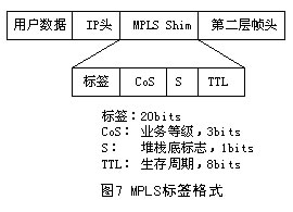 標(biāo)簽的格式取決于分組封裝所在的介質(zhì)。例如,ATM封裝的分組(信元)采用VPI和/或VCI數(shù)值作為標(biāo)簽,而幀中繼PDU采用DLCI作為標(biāo)簽。對于那些沒有內(nèi)在標(biāo)簽結(jié)構(gòu)的介質(zhì)封裝,則采用一個(gè)特殊的數(shù)值填充。圖7給出4字節(jié)填充標(biāo)簽的格式,它包含一個(gè)20bits的標(biāo)簽值、一個(gè)3bits的CoS值、一個(gè)1bit的堆棧標(biāo)識(shí)符和一個(gè)8bits的TTL值。此外.如果填充值被插入到一個(gè)PPP或以太網(wǎng)幀中,包含在各幀頭中的一個(gè)協(xié)議ID(或以太網(wǎng)類型)表示一個(gè)幀或者一個(gè)