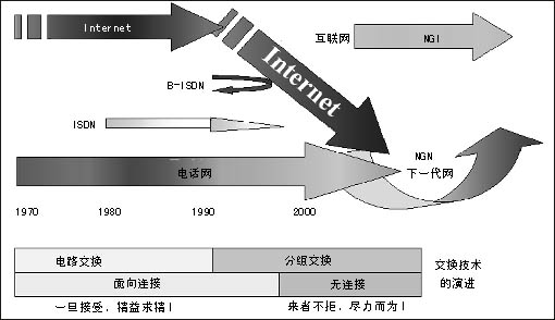傳統(tǒng)電信網(wǎng)和互聯(lián)網(wǎng)都面臨著挑戰(zhàn),基于電話業(yè)務(wù)設(shè)計(jì)的電路交換網(wǎng)不能靈活適應(yīng)帶寬各異的數(shù)據(jù)業(yè)務(wù)的發(fā)展。專為數(shù)據(jù)業(yè)務(wù)設(shè)計(jì)的互聯(lián)網(wǎng)則存在著安全性、可管理性、商業(yè)模式等問題的困擾。NGI對目前電信網(wǎng)的主要盈利業(yè)務(wù)語音的質(zhì)量保證以及對電信網(wǎng)增長空間很大的業(yè)務(wù)(移動)關(guān)注不夠。NGI可能達(dá)到的目標(biāo)不能滿足電信界的需要。因此,在NGI之后ITU和ETSI等提出了更高的目標(biāo)——NGN,這就是NGN的提出背景。信息產(chǎn)業(yè)部電信研究院科技委副主任委員雷震洲認(rèn)為,兩大亮點(diǎn)點(diǎn)燃了NGN:一是數(shù)據(jù)超過語音的信息需求,全球互聯(lián)網(wǎng)用戶目前已逾7億,全世界在網(wǎng)上傳送的以IP為代表的數(shù)據(jù)業(yè)務(wù)量已經(jīng)超過語音業(yè)務(wù)量;二是移動超過固定的個性化需求,全球移動用戶已經(jīng)超過13億,近100個國家的移動用戶數(shù)已經(jīng)超過固定用戶數(shù),我國在2003年10月移動用戶也超過了固定用戶數(shù)。