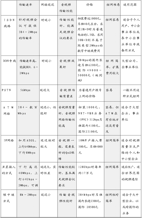 對(duì)于普通的個(gè)人用戶,如果想嘗試一下視頻會(huì)議的感受可以試一試PSTN接入。PSTN公共電話網(wǎng)是目前使用最廣泛的網(wǎng)絡(luò)系統(tǒng),它的優(yōu)點(diǎn)是覆蓋區(qū)域廣、易于使用、價(jià)格較低,聯(lián)網(wǎng)容易。但網(wǎng)絡(luò)速度僅能提供到56kbps,線路質(zhì)量較差,傳輸速率較低。對(duì)于視頻會(huì)議的聲音圖像傳輸遠(yuǎn)遠(yuǎn)不夠,基于軟件的視頻會(huì)議系統(tǒng)能達(dá)到4f/s的圖像傳輸速率,其最大的缺點(diǎn)是圖像質(zhì)量太差,會(huì)大大影響會(huì)議的質(zhì)量,一般用得很少。