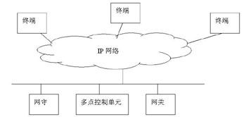 基于H.323的軟件視頻會(huì)議系統(tǒng)由相應(yīng)的協(xié)議族提供支持,使得這樣的系統(tǒng)能夠有很強(qiáng)的適應(yīng)性、兼容性。H.323建議的多媒體會(huì)議系統(tǒng)不是基于客戶服務(wù)器結(jié)構(gòu),而是基于傳統(tǒng)的電話呼叫網(wǎng)絡(luò)模式。H.323為基于網(wǎng)絡(luò)的通信協(xié)議定義了4個(gè)主要的組件:終端(Terminal)、網(wǎng)關(guān)(Gateway)、網(wǎng)守(Gatekeeper)和多點(diǎn)控制單元(MCU)。基本拓?fù)浣Y(jié)構(gòu)結(jié)構(gòu)如圖: