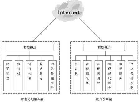 視頻會(huì)議系統(tǒng)一般由視頻控制服務(wù)器、會(huì)議客戶端軟件以及IP傳輸網(wǎng)絡(luò)系統(tǒng)組成(如圖1所示)。