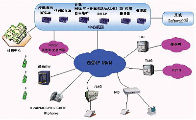 圖1 基于城域網(wǎng)提供軟交換相關(guān)業(yè)務(wù)的系統(tǒng)結(jié)構(gòu)