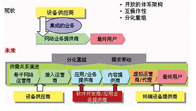 隨著市場(chǎng)對(duì)業(yè)務(wù)的需求越來(lái)越高,運(yùn)營(yíng)商扮演業(yè)務(wù)開(kāi)發(fā)者和業(yè)務(wù)提供者角色將不再能夠滿(mǎn)足需求,新業(yè)務(wù)的提供速度與業(yè)務(wù)的種類(lèi)都逐步處于劣勢(shì),這時(shí)運(yùn)營(yíng)商需要放棄原來(lái)屬于自己的利益,從全業(yè)務(wù)提供商逐步演變?yōu)榫W(wǎng)絡(luò)提供商和網(wǎng)絡(luò)業(yè)務(wù)集成商。例如,通過(guò)與ICP/ISP的合作,構(gòu)造NGN業(yè)務(wù)價(jià)值鏈,提供包括網(wǎng)絡(luò)教育、網(wǎng)絡(luò)證券等寬帶增值服務(wù);通過(guò)開(kāi)放的Parlay
