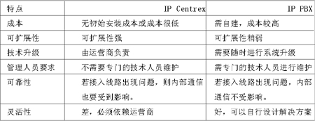 運(yùn)營商自然不會(huì)聽之任之,因此推出了IP Centrex業(yè)務(wù)與其相抗衡。由附表可以很明顯地看出,與IP PBX相比,IP Centrex的優(yōu)勢有:初期投入成本小、以辦公費(fèi)用方式容易控制現(xiàn)金流;無須對(duì)網(wǎng)絡(luò)、業(yè)務(wù)平臺(tái)進(jìn)行維護(hù);平臺(tái)規(guī)模與公司規(guī)模同步增長;具有對(duì)公網(wǎng)的開放性;辦公地點(diǎn)的任意性、易擴(kuò)展;使企業(yè)集中在主營業(yè)務(wù)領(lǐng)域;業(yè)務(wù)可擴(kuò)展性好。