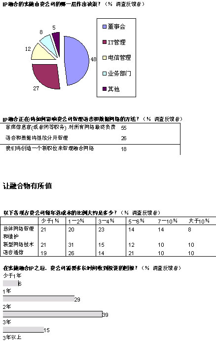 總之,這就是基本的理論。許多公司管理層對此表示贊成:在成熟的國家市場上,企業(yè)轉向融合網(wǎng)絡正在獲得青睞。但是,融合是否符合他們的預期?公司對融合網(wǎng)絡的運作有何計劃?從他們的經(jīng)驗中可以學到什么?