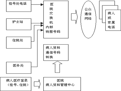 病人資料數(shù)據(jù)庫保存的病人資料均與病人住院、就診代號對應(yīng),醫(yī)護(hù)人員因工作需要欲與病人或家屬聯(lián)系時,使用本部門的電話通過呼叫中心獲得使用權(quán)限。交換機(jī)給醫(yī)院內(nèi)部指定一個"特服號碼",負(fù)責(zé)與病人通信。