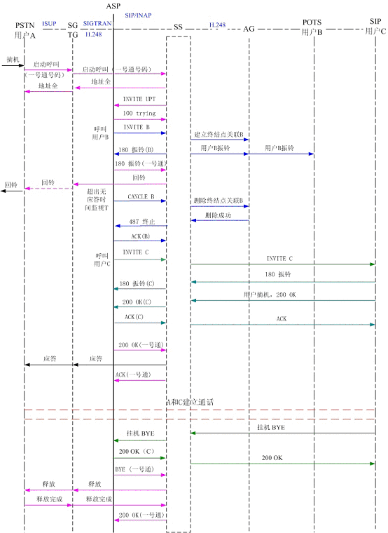 圖4為PSTN用戶A撥打一號通用戶,同振到軟交換域AG下POTS用戶B和SIP用戶C,其中軟交換和應(yīng)用服務(wù)器以SIP協(xié)議相連,軟交換和AG、軟交換和TG以H.248協(xié)議相連?梢钥吹,用戶B和用戶C同時振鈴,用戶C摘機應(yīng)答,應(yīng)用服務(wù)器取消了對用戶B的振鈴。雙方通話,通話結(jié)束,用戶C掛機,系統(tǒng)釋放了連接。