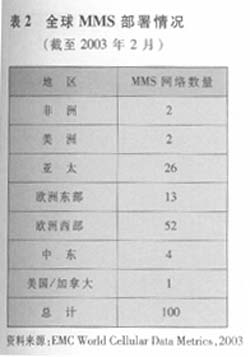 據(jù)EMC統(tǒng)計,到2003年2月,全球在47國家有100家運營商部署了MMS網(wǎng)絡(luò)(見表2)。