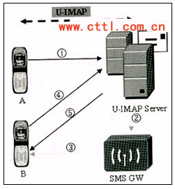 2)UIMAP Server把郵件存入目標(biāo)手機終端B的郵箱,并向短信中心發(fā)送新郵件到達的短信以通知用戶;