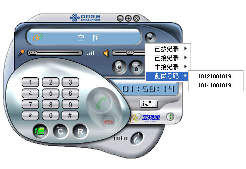 通話記錄很詳細,除了“已撥”、“已接”、“未接”外,還有一項“測試號碼”,可以讓用戶撥打聯(lián)通“寶視通”的服務熱線測試可視電話是否正常工作,也可以向服務人員詢問相關的服務內容。